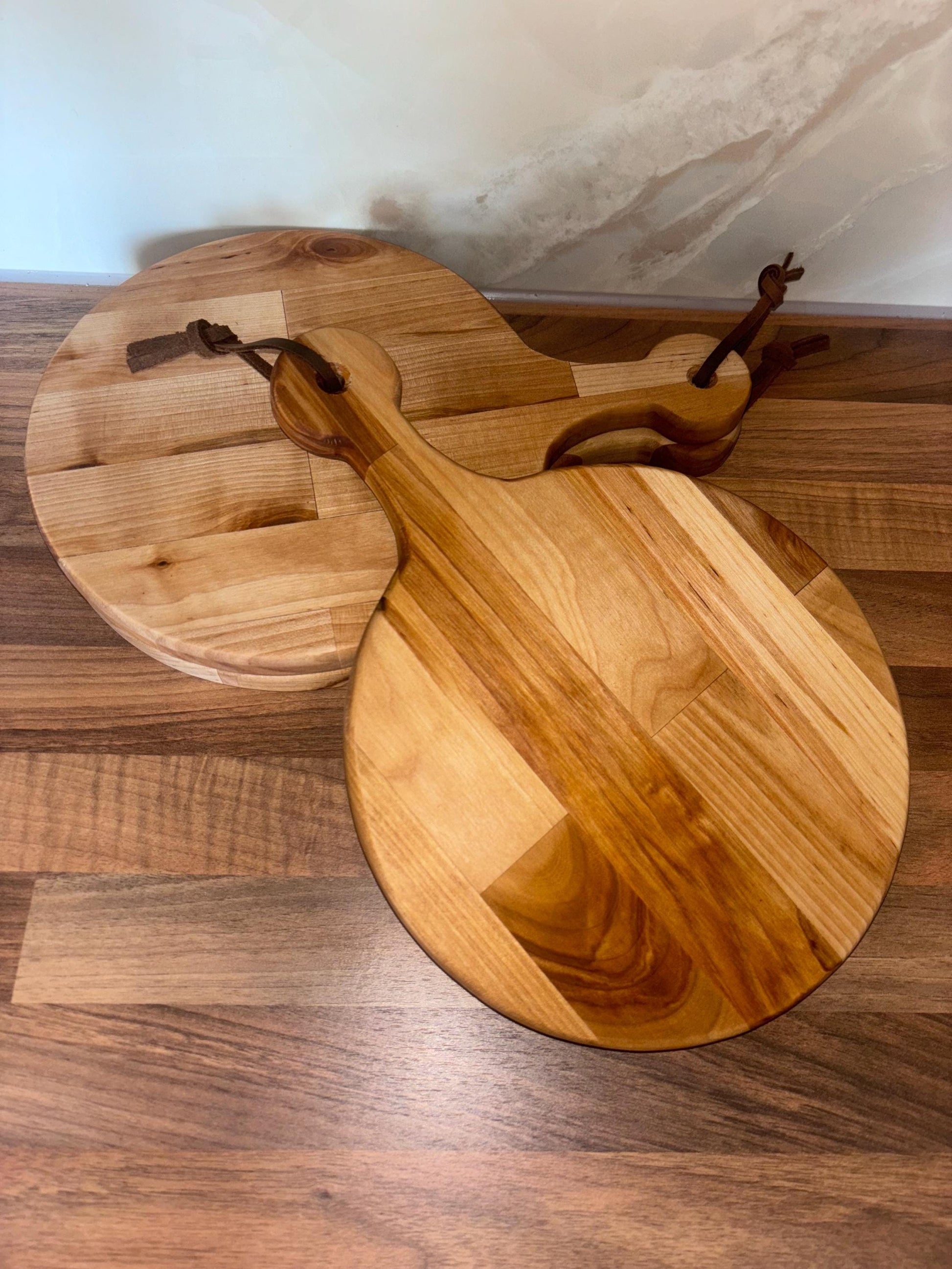 Handmade Hardwood Cutting Board | Charcuterie Board | Chopping Board | Serving Platter - a blend of craftsmanship and functionality. Crafted from a high quality hardwood and finished in food safe mineral oil, this charcuterie board adds a touch of old-world charm to your home. The natural beauty of the wood brings warmth and character, making this board a charming addition to any setting. Each board is unique and comes adorned with a leather cord for wall hanging, providing a stylish aesthetic. Approximate dimensions 30cm x 21cm x 2cm.