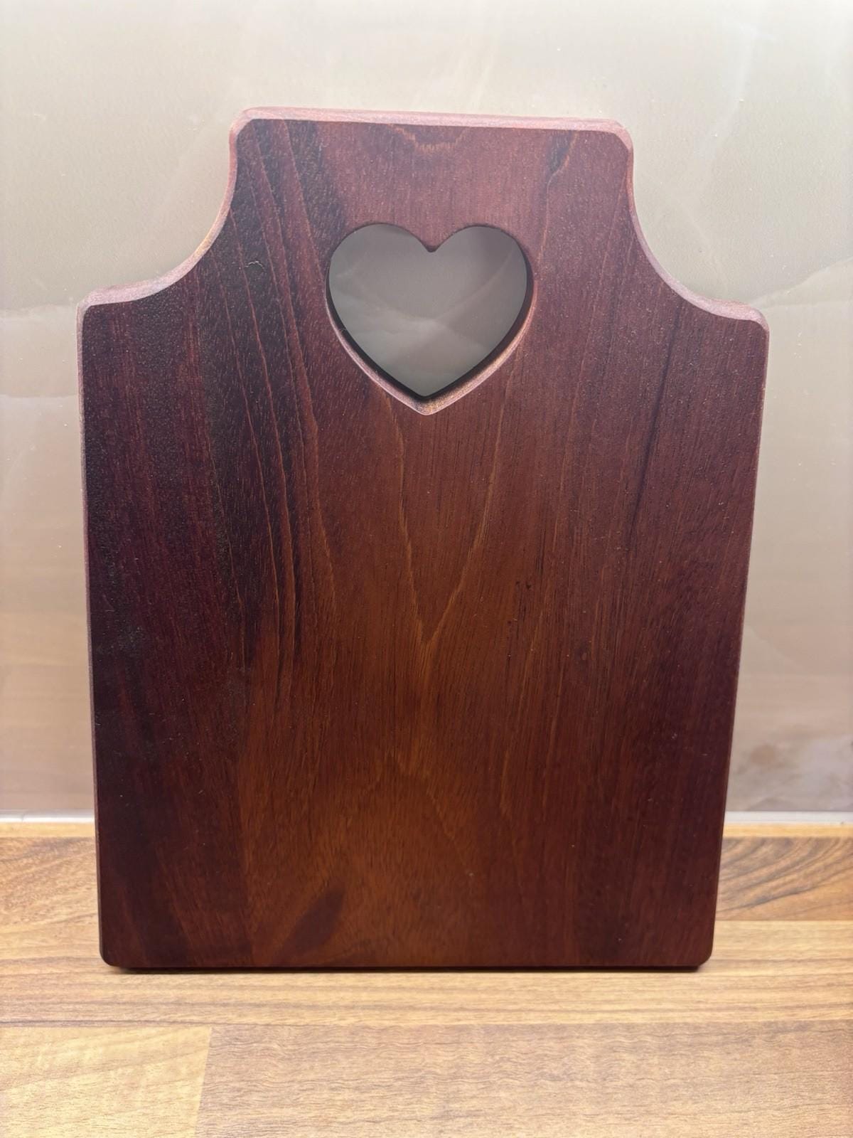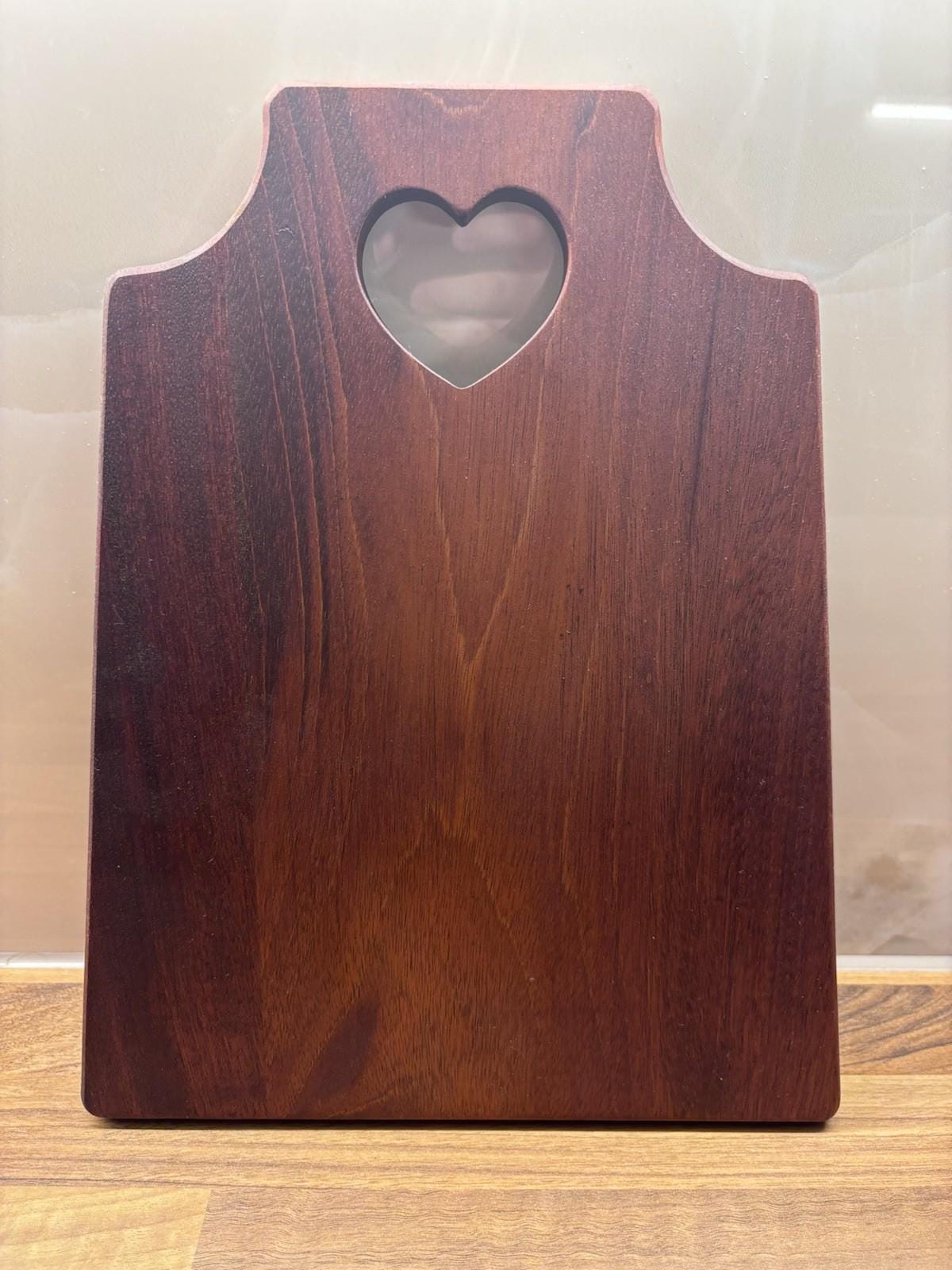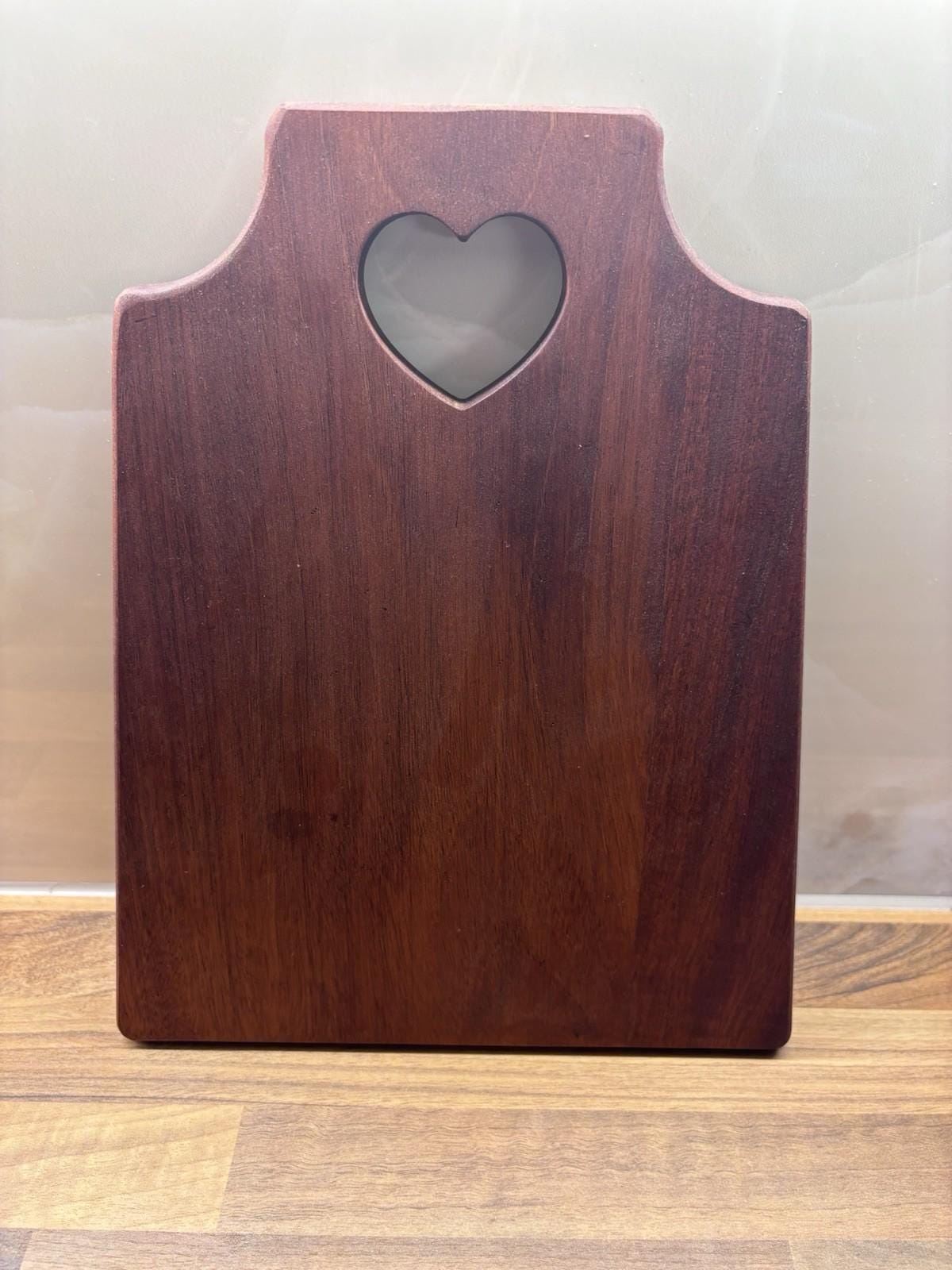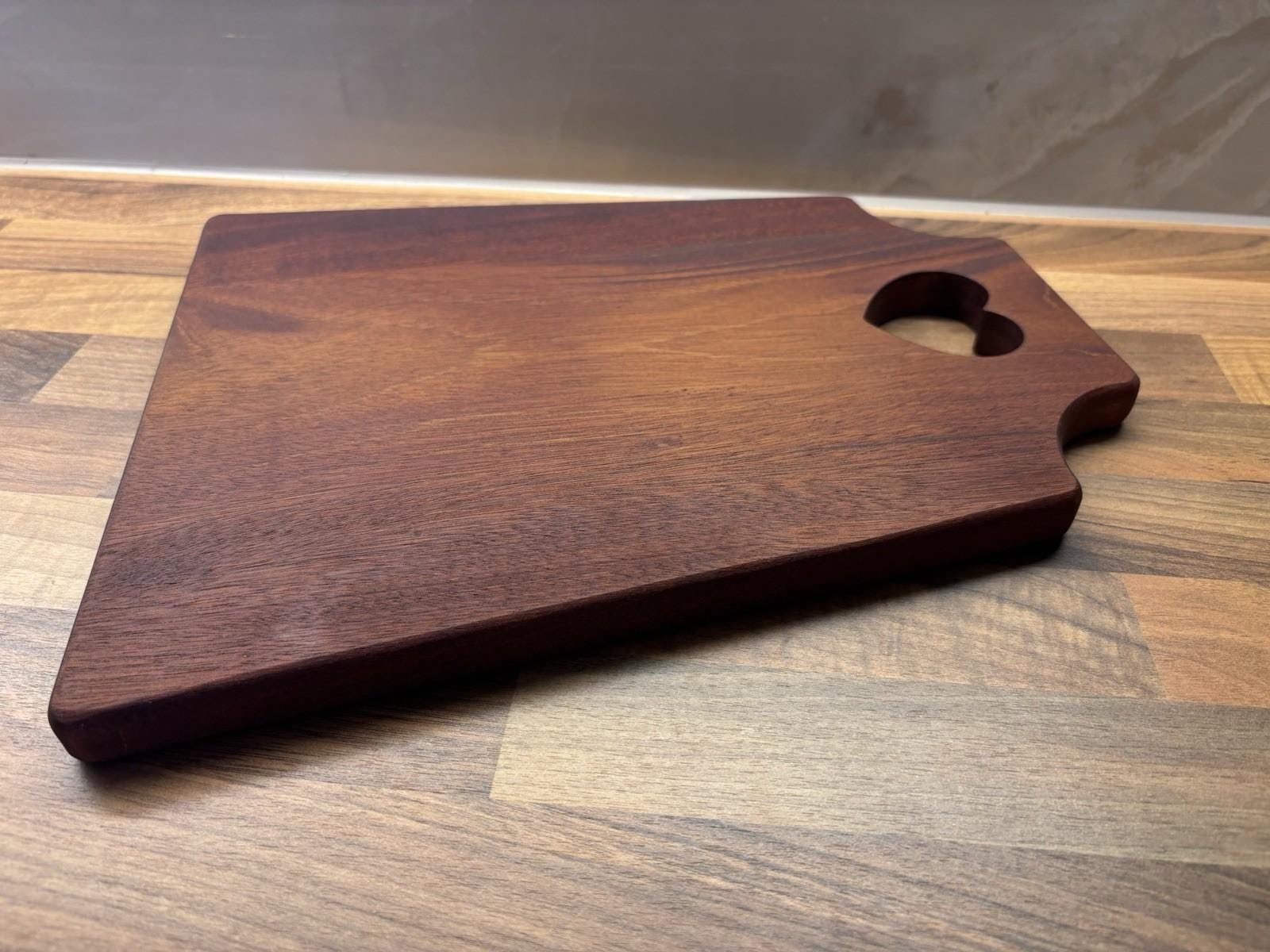 Handmade Mahogany Cutting Board | Charcuterie Board | Chopping Board | Serving Platter - a blend of craftsmanship and functionality. Crafted from mahogany hardwood and finished in food safe mineral oil, this charcuterie board adds a touch of old-world charm to your home. The natural beauty of the oak brings warmth and character, making this board a charming addition to any setting. Each board is unique and comes adorned with a love heart cutout, providing a stylish aesthetic. Approximate dimensions 32cm x 26cm x 2cm.