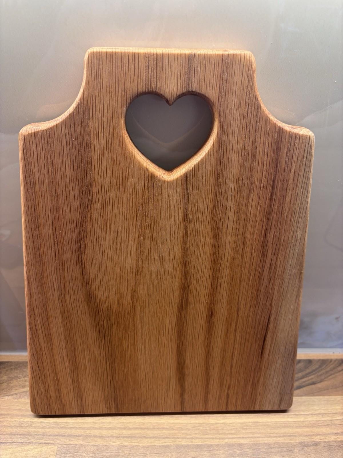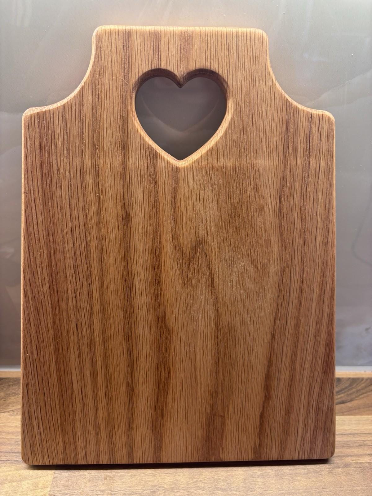Handmade Oak Cutting Board | Charcuterie Board | Chopping Board | Serving Platter - a blend of craftsmanship and functionality. Crafted from oak and finished in food safe mineral oil, this charcuterie board adds a touch of old-world charm to your home. The natural beauty of the oak brings warmth and character, making this board a charming addition to any setting. Each board is unique and comes adorned with a love heart cutout, providing a stylish aesthetic. Approximate dimensions 32cm x 26cm x 2cm.