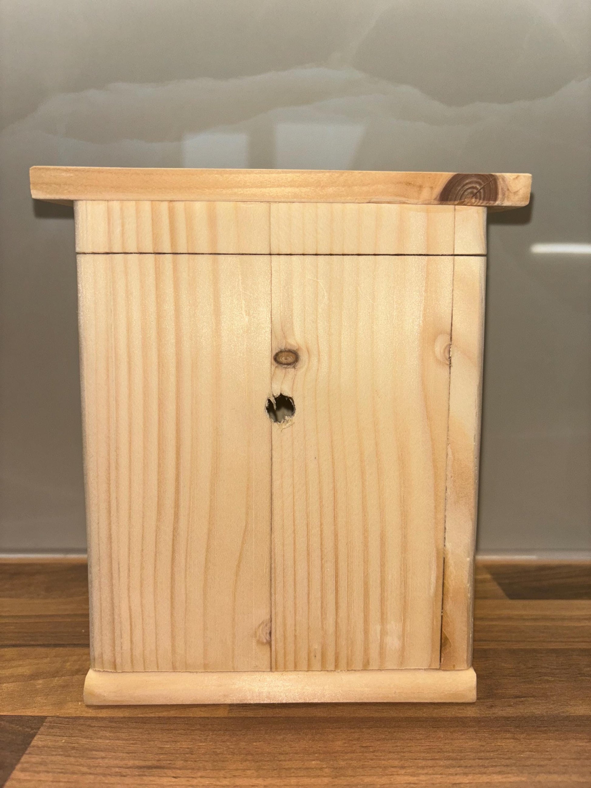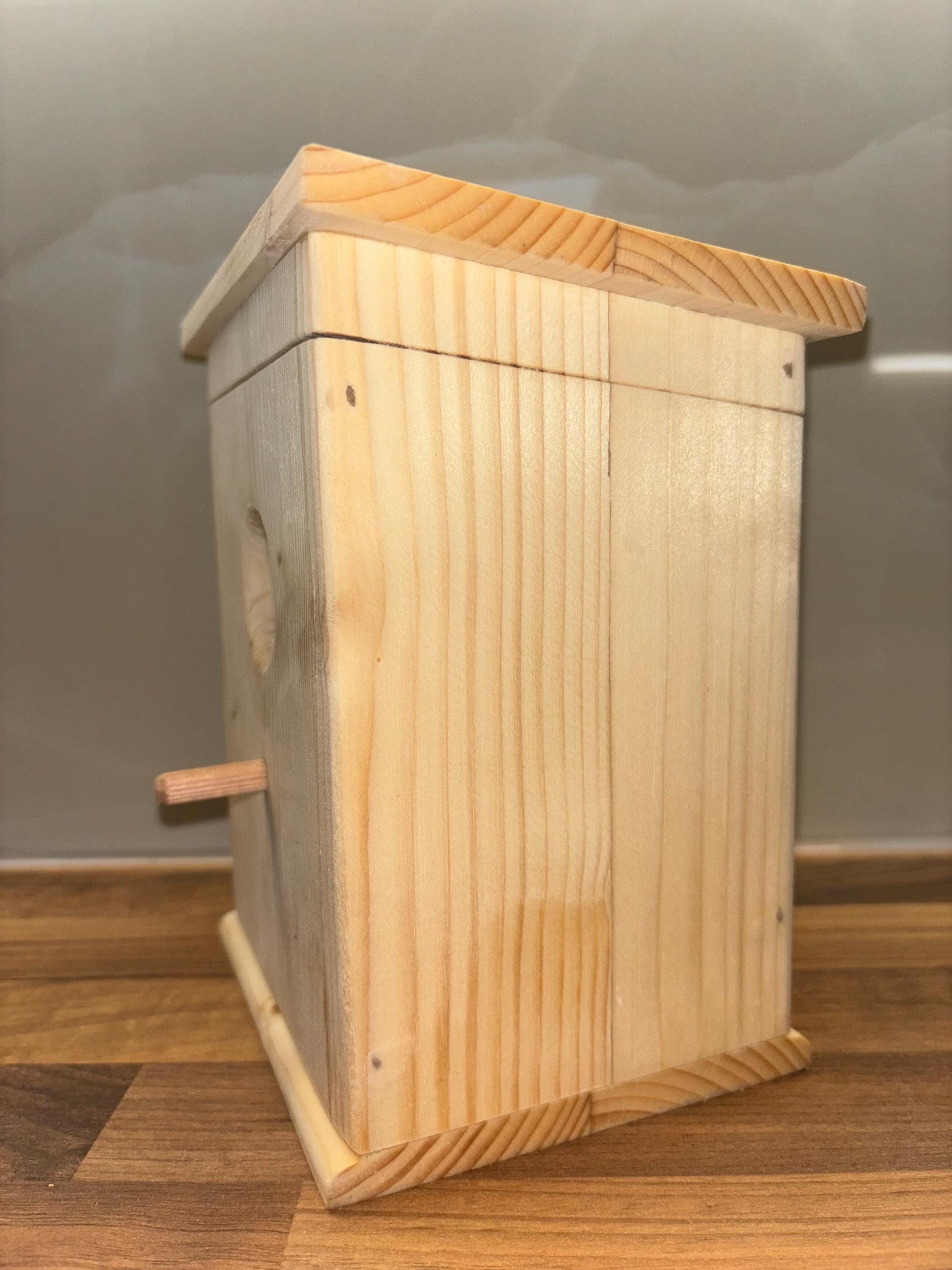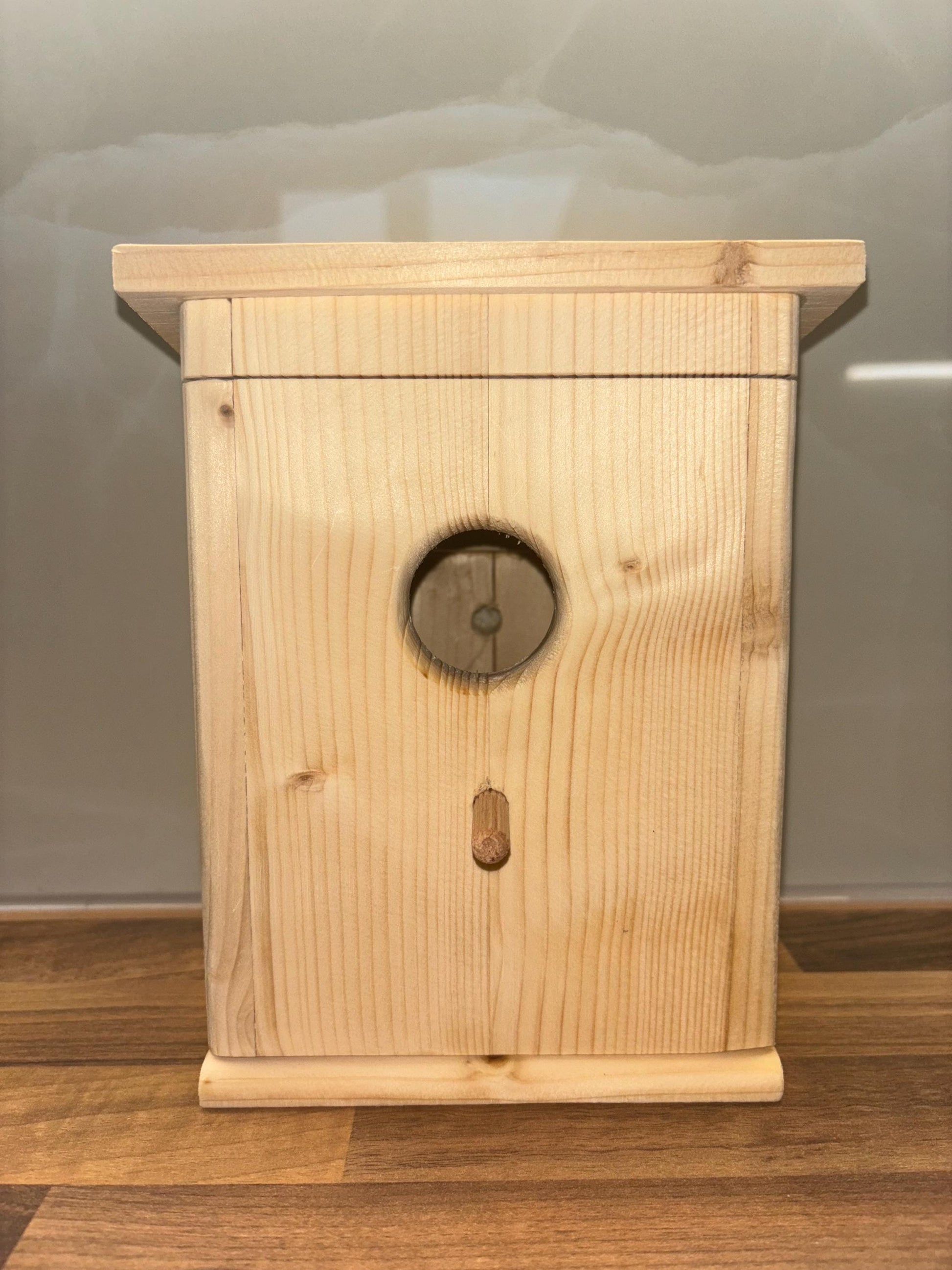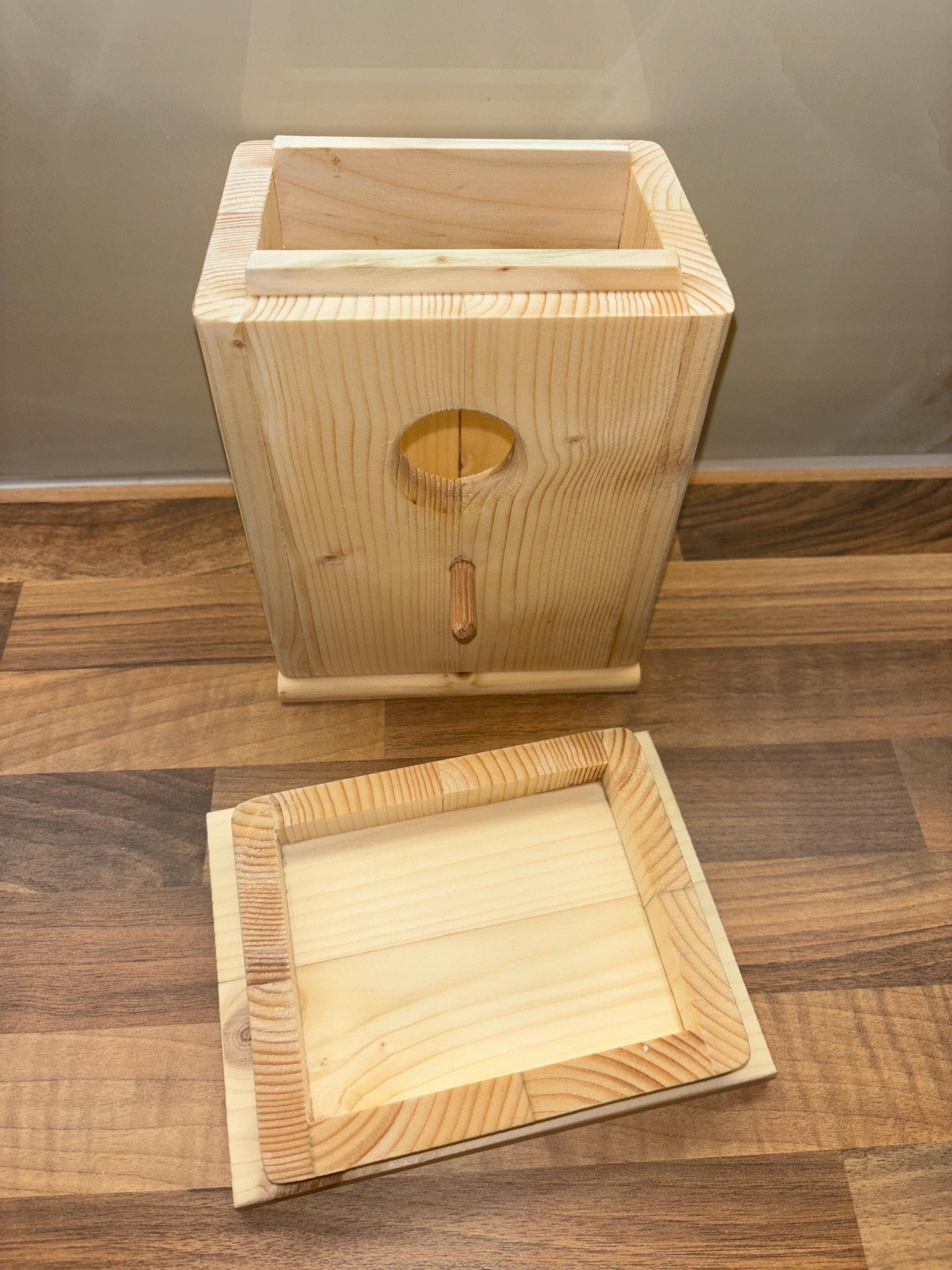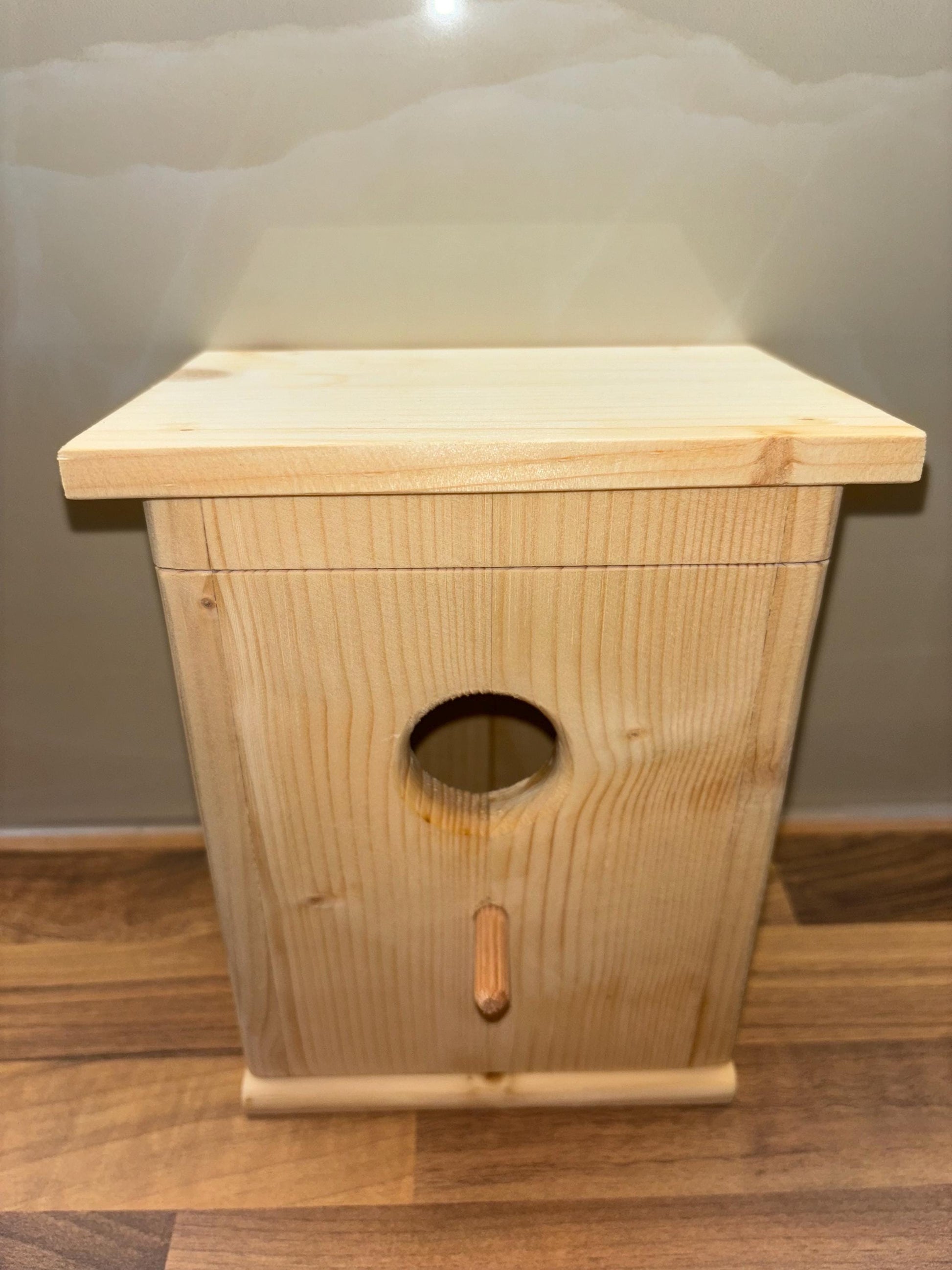 Handmade bird box, nesting box made of treated pine wood. This bird box has also been designed so that it can be cleaned inside once the bird’s have finished nesting with an easily removable lid. It comes ready to hang! Approx. measurements 16cm x 20cm x 12cm.